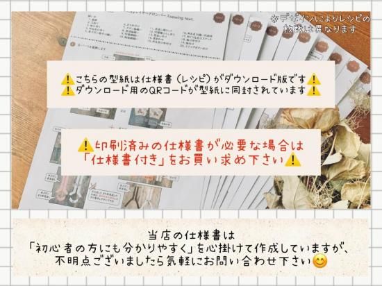 こちらの型紙には仕様書がダウンロード可能なQRコードが同封されていますのでお客様でプリントアウトが可能です。